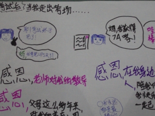 之后,纪木英赛姐引导同学们冥想明年考试放榜时刻的景象和心情,再让同学们画出要对父母、老师和自己说的心中话。吴芊慧同学的画面充满五彩缤纷的心声和感恩话语,而 王海华同学的画则呈现一幅温馨的景象。
