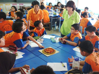 午饭后的活动环节是用旧报纸制作‘披萨’。同学们充分发挥想象力,尽情挥洒色彩,在热闹、愉快气氛中制作出惟妙惟肖,各具特色的‘披萨’。纪老师从该活动中引出同学们对习惯之二:‘以终为始’,即先定目标后有行动,的反思。