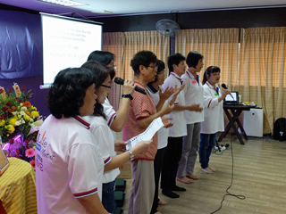午餐过后,每一组的学员分别上台演绎赞歌,大家发挥创意,以独特的方式传达对世尊的敬爱。讲堂里回荡着歌声、笑声、喝彩声,处处弥漫着轻松愉悦的氛围。在《Swami 我爱你》的合唱声中,学员们手捧莲灯环绕讲堂,依次向世尊法相参拜祈福。学员们把莲灯布置成心形莲灯图,大家看了脸上都洋溢着喜悦感激之情,宁静虔诚的神色。最后,学员们一起在摇曳烛光中高唱生日歌,欢喜切寿糕。